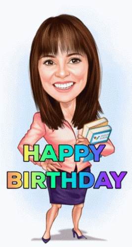 Cartoon of Karrie Ann Fox holding books with 'Happy Birthday' text, associated with Engage And Grow.