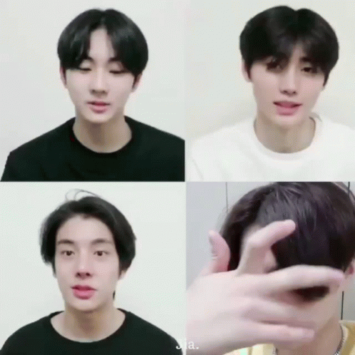 Enhypen members Jungwon, Sunghoon, Jay, and Jake in a split-screen video, touching their hair and faces.