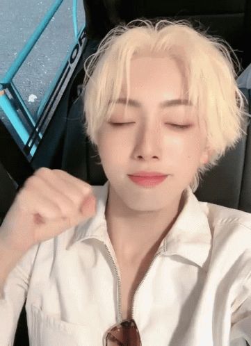 Nakamoto Taiga (Enjin) with blonde hair, sitting in a car, making a small fist gesture.