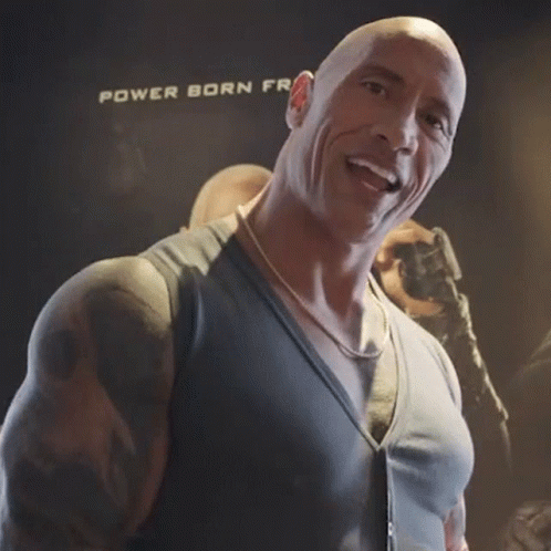 Dwayne Johnson smiling broadly in front of a 'POWER BORN' poster, exuding happiness.