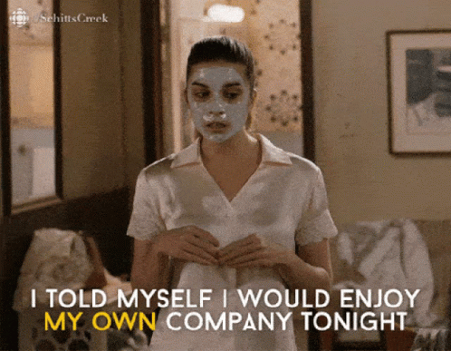 A character from Schitt's Creek, wearing a face mask, declares, "I told myself I would enjoy my own company tonight." A relatable moment of self-care.
