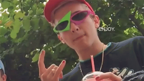 Roy Purdy in unique sunglasses, making a rock and roll sign, holding a slushie, with 'Enjoy' text.