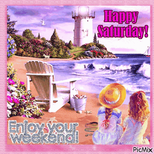 Two girls on a picturesque beach with a lighthouse, wishing 'Happy Saturday! Enjoy your weekend!'
