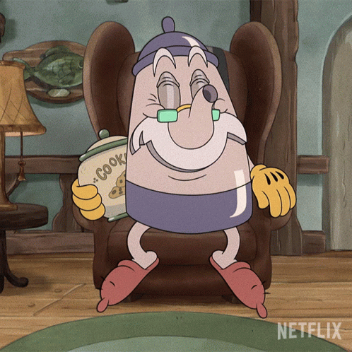 Elder Kettle from The Cuphead Show relaxing in an armchair, happily holding a cookie jar.