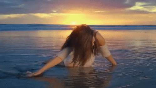 Shania Twain kneels in the ocean water at sunset, enjoying a serene moment on the beach.