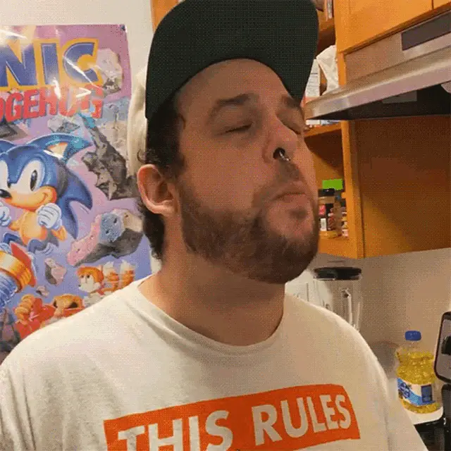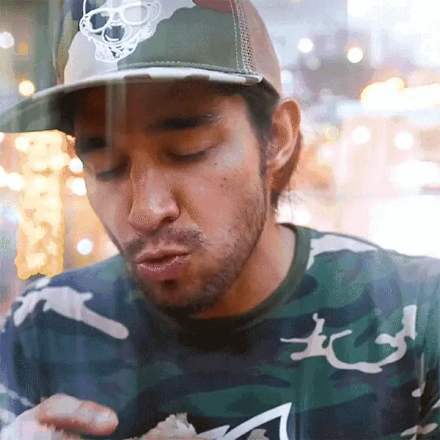 Brian Lagerstrom closes his eyes, savoring a delicious bite of food in a modern kitchen.