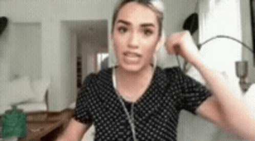 Lali Espósito makes an exaggerated angry face and gestures wildly while wearing headphones in a living room.