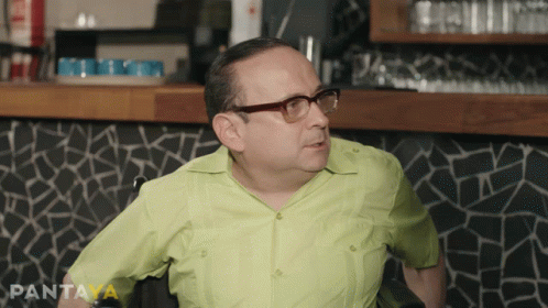 Lalo España, wearing glasses and a green shirt, appears angry and upset in a bar setting.