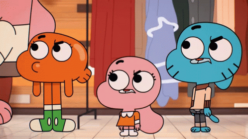 Anais, Gumball, and Darwin look angry and upset, standing with their arms crossed in a cartoon setting.