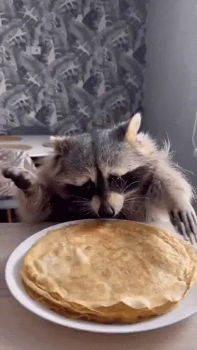 A raccoon gets incredibly excited, opening its mouth wide, before a plate of dessert.