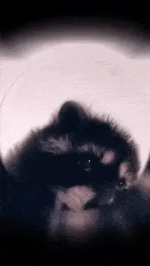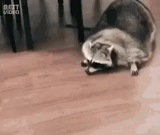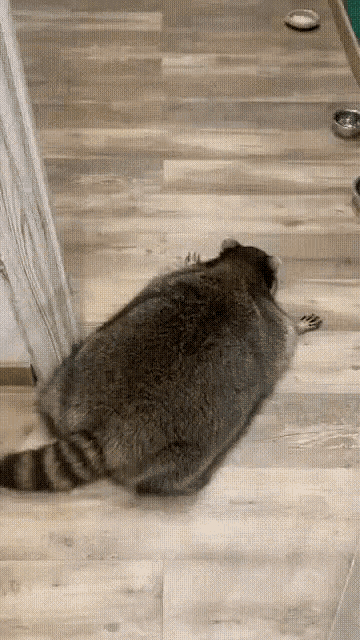 A fluffy raccoon sits by food bowls on a wooden floor, then a dog appears and approaches it.