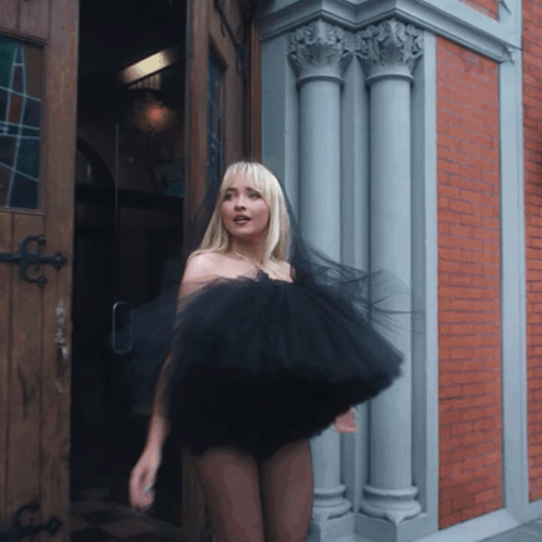 Sabrina Carpenter smiling brightly in a strapless black tulle dress and veil outside a building.
