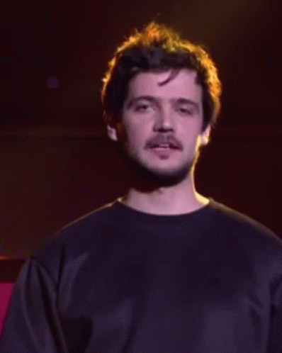 A man in a black shirt with dark hair and a mustache, as the words 'Enter language' appear on screen.