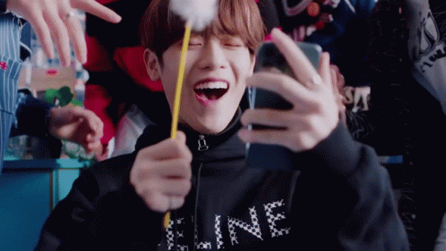 Epex member Keum Donghyun laughs joyfully, holding a yellow pencil and phone during a lively Do4Me celebration.