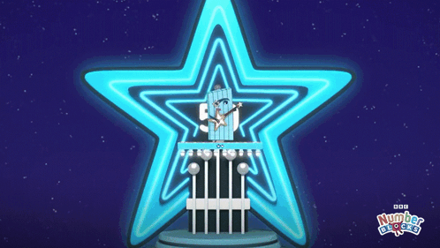 Numberblocks character performs an epic guitar solo on a star stage, celebrating the number fifty with fireworks.