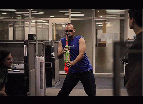 Epic Sax Guy Ariel performs in an office, playing a toy saxophone while wearing a Samsung shirt and sunglasses.