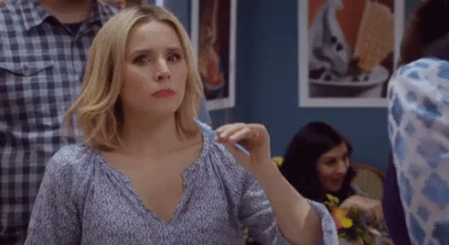 A woman has an epiphany, holding a toothbrush, in a scene from The Good Place.