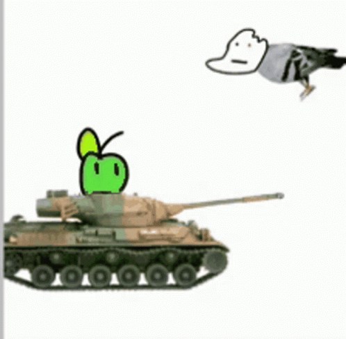 Green apple character 'Apple Horas' on a tank shoots a pigeon with a drawn face.