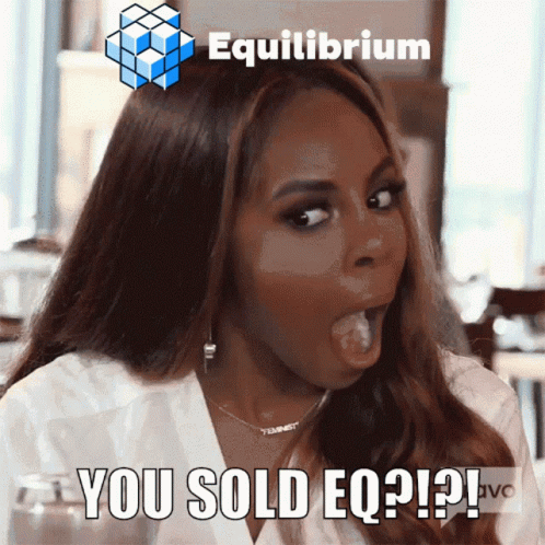 A woman with a surprised expression reacts to the question 'YOU SOLD EQ?!?!' with the Equilibrium logo.
