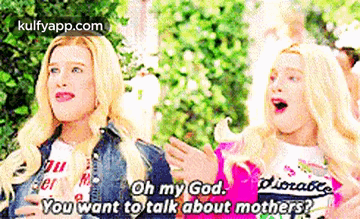 Two blonde women react dramatically, with one exclaiming, "Oh my God, you want to talk about mothers?"