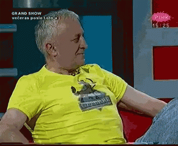 Era Ojdanic, the turbofolk singer, sits on a red couch in a yellow shirt during the Grand Show.