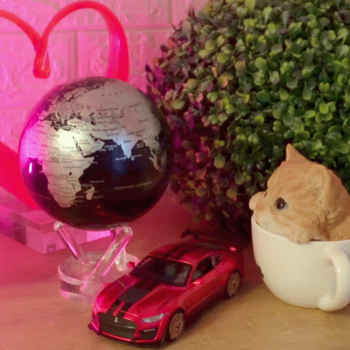 Sari Tyler's cute cat figurine in a cup next to a rotating globe and a red toy Mustang car.