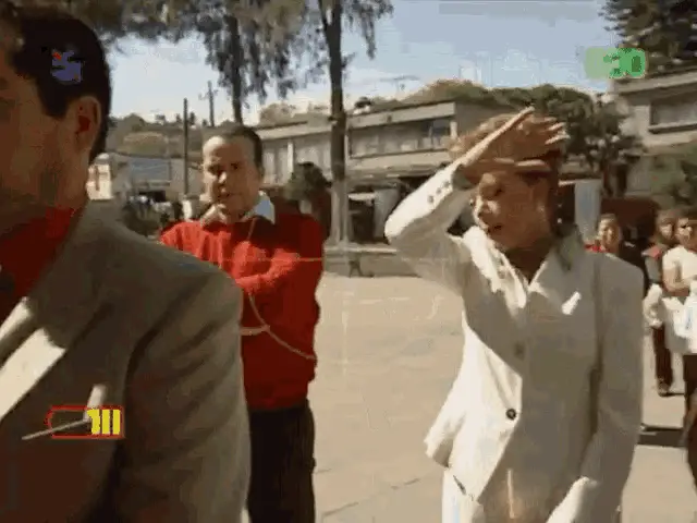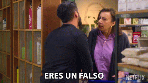 Carmela Villalobos (Veronica Langer) confronts a man, accusing him of being a fake and telling him to leave her alone.
