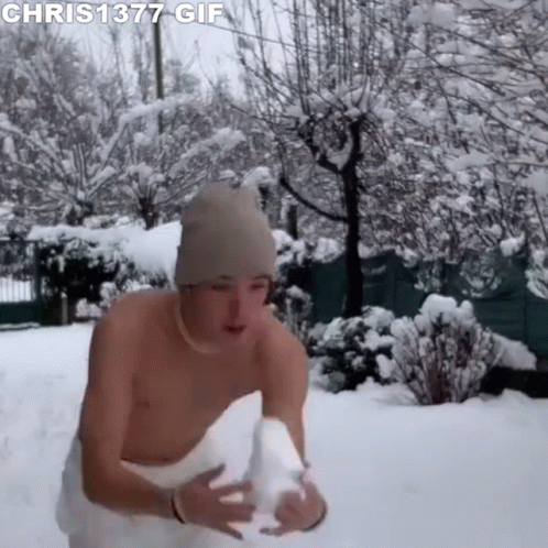 Ergennaro Alessandro, shirtless in a beanie, playfully throws snow into the air in a winter wonderland.