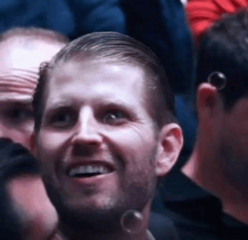 Eric Trump smiling and looking up as bubbles float around him in a crowd.