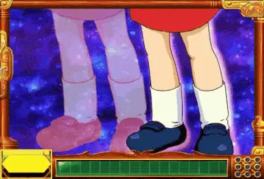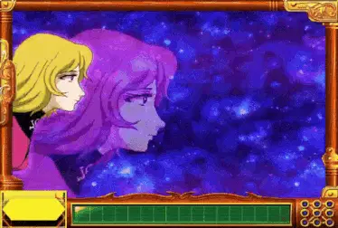 a close up of a girl with blue hair and a pink bow on her head making a funny face .