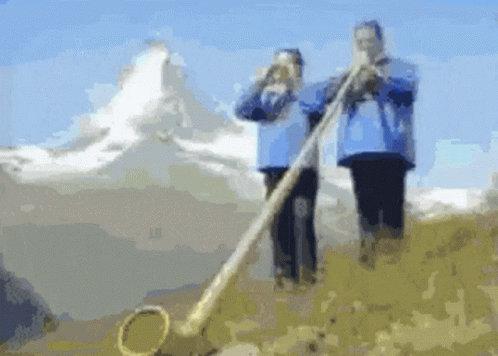 Erika Ricola playing an alphorn in the Alps with a majestic mountain backdrop.