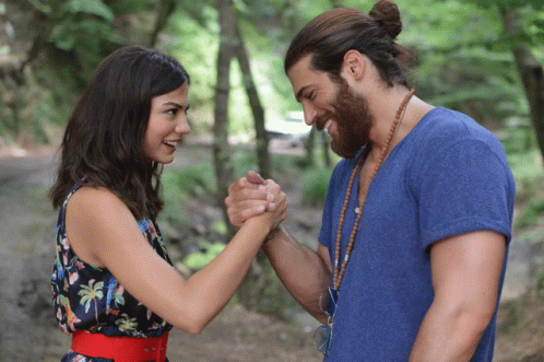 Can Yaman and Demet Ozdemir from Erkenci Kus share a happy, smiling moment, holding hands in a lush forest.