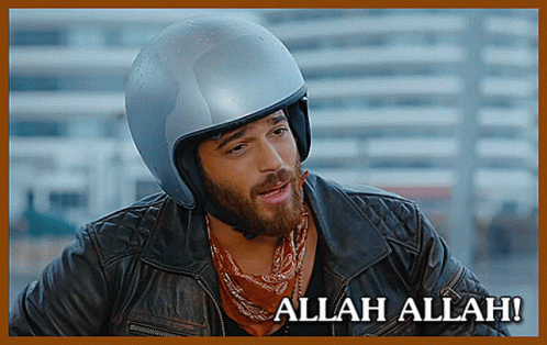 Can Yaman as Can Divit in Erkenci Kus, reacting with an 'Allah Allah!' expression while wearing a helmet.