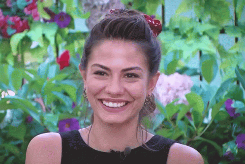 Demet Özdemir as Sanem from Erkenci Kuş, smiling brightly and looking up in a garden setting.