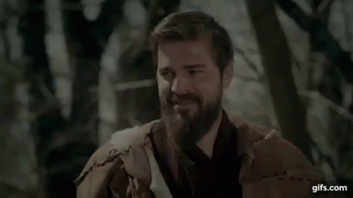 Ertugrul Dirilis smiling and laughing in a forest setting.