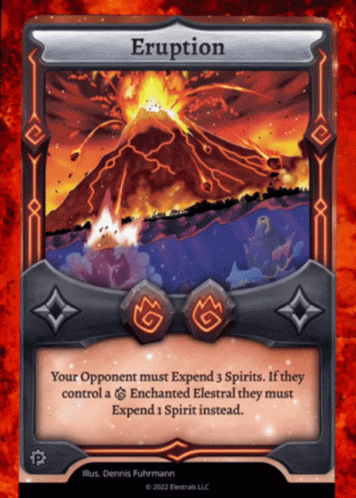 A digital card named Eruption, featuring a volcanic eruption and lava, impacting Elestrals game mechanics.