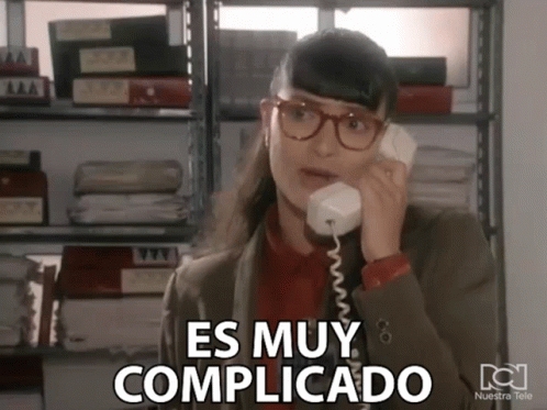 Betty (Ana Maria Orozco) on the phone, expressing 'It's very complicated' in a classic scene from Yo Soy Betty La Fea.
