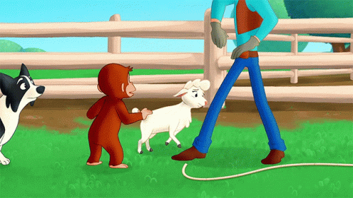 Curious George, a cowboy, a sheep, and a dog in a playful farm scene with a lasso attempt.