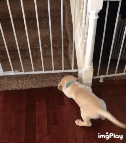 A clever puppy, possibly named Sneaky, attempts to escape a baby gate blocking the stairs.