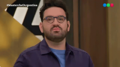 Damian Betular on Masterchef Argentina, wearing glasses and pointing to his ear, urging to listen.