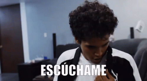 Harold Benny passionately shouts 'Escúchame' into a microphone while wearing a black and white Puma jacket.