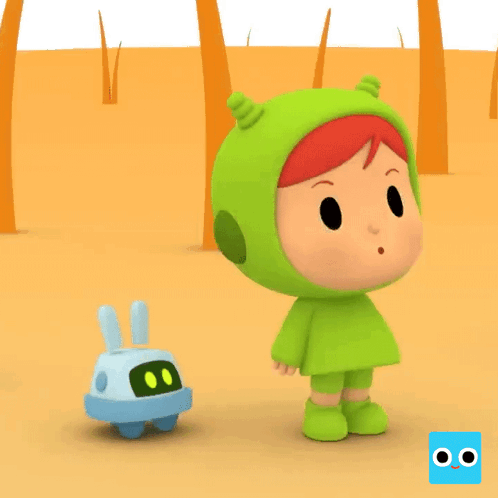 Nina from Pocoyo in a green suit interacts with a small blue robot in an orange landscape.