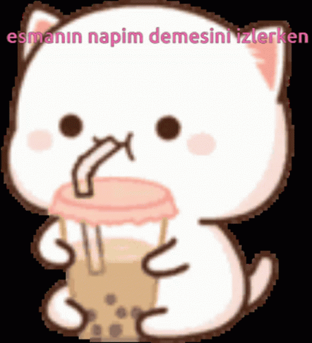 A cute cartoon cat drinks bubble tea while reacting to Esma saying "what should I do" (napim).