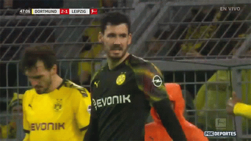 Roman Bürki and a teammate exchange a fist bump during a Borussia Dortmund vs. Leipzig Bundesliga match.