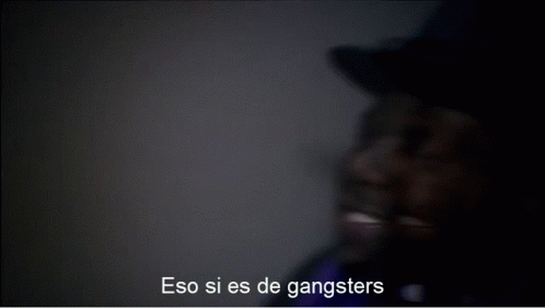 A dark, blurry clip of a man in a hat with the Spanish text 'Eso si es de gangsters' (That is indeed gangster).