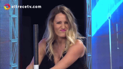 Mica Viciconte makes a funny, scrunched-up face in front of an El Trece TV screen.