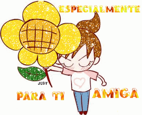 A sweet girl holds a vibrant sunflower, offering it to a friend with the words 'Especialmente Para Ti Amiga'.
