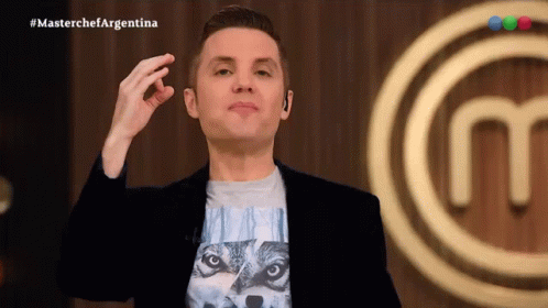 Santiago Del Moro exclaims 'Espectacular' on Masterchef Argentina, wearing a wolf t-shirt.