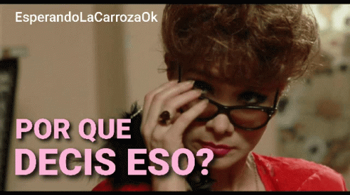 Tia Nora from Esperando La Carroza, wearing glasses, asks 'Why Do You Say That?' with a smile.