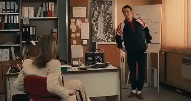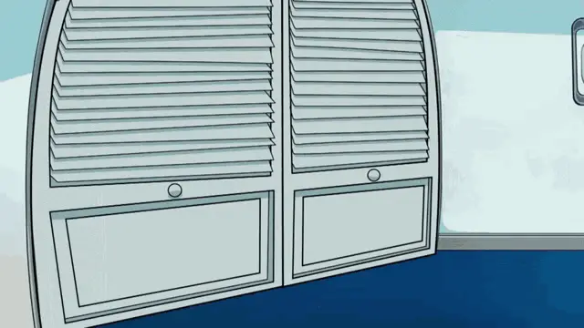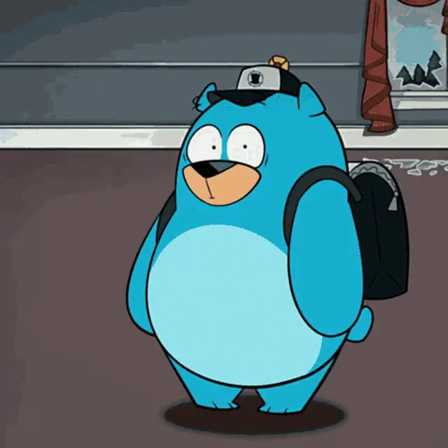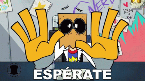 Dr. Flug from Villainous with his hands up, saying 'Wait!' in a moment of surprise or pause.